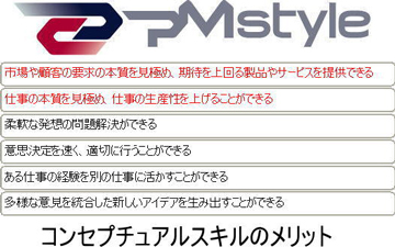 PMstyleは、「プロジェクトをビジネスのエンジンにする」をテーマに活動しています。今回は、イノベーションに必要なコンセプチュアルスキル、プロジェクトマネジメント、PMOについて、スライド画像と解説を展示し、ブース内でご説明しております。テクニカルスキル、ヒューマンスキルだけでは、イノベーションを進めることはできません。コンセプチュアルスキルを向上させ、プロジェクトマネジメントで進めていきましょう。